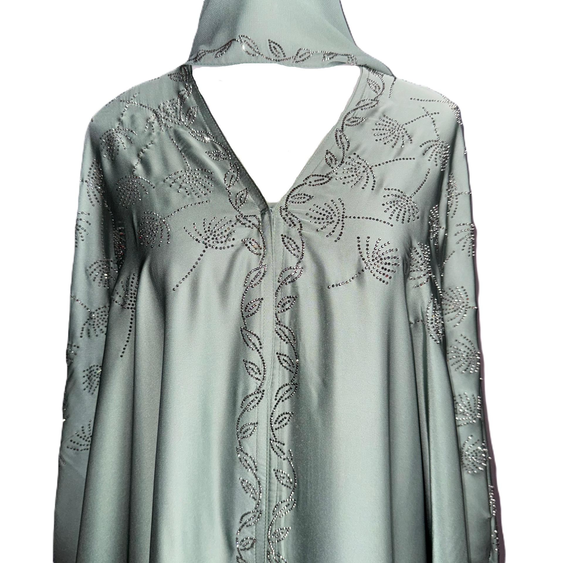 In a soft, enchanting shade of sage green, this exquisite design captures the essence of tranquil luxury. Crafted from smooth Armani satin and adorned with sparkling rhinestones, Celestial Sage drapes you in a timeless beauty, where every movement radiates grace and sophistication. Perfect for those special moments where elegance meets celestial charm.